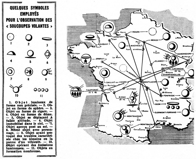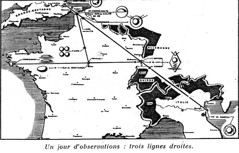 L'auteur explique comment il s'est vite rendu compte qu'en groupant les observations faites par des gens de bonne foi on obtenait de surprenants résultats. Il a découvert ainsi qu'en reliant par un fil les différentes observations faites d'une même journée, les soucoupes volantes se propagent en lignes droites. Dans la carte que nous publions ici, la logique des divers parcours y apparaît clairement.