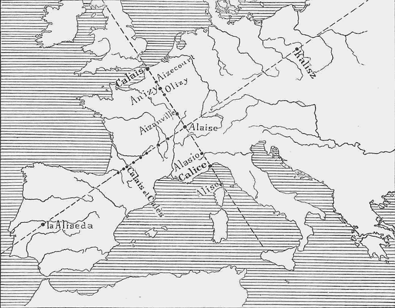 « Je l’oublie si peu, mon cher collègue, que c’est précisément à Versailles – Versailles-Paris – que je vais vous convier à m’accompagner dans quelques instants !… Jetez les yeux sur cette carte : ces lignes rigoureusement droites ont été tracées en joignant des localités portant les noms, plus ou moins déformés, d’alésias. Voici la ligne « Espagne-Pologne », qui part de la Aliseda, franchit les Pyrénées, passe à Aizieux l’Allée, à Eauze, embroche Calés, Calais, Alès, perfore les Allis près de Rocamadour, le Calais Puy-de-Dôme, Montalays, Alaise du Doubs… et va finir à Kalisz en Pologne !
