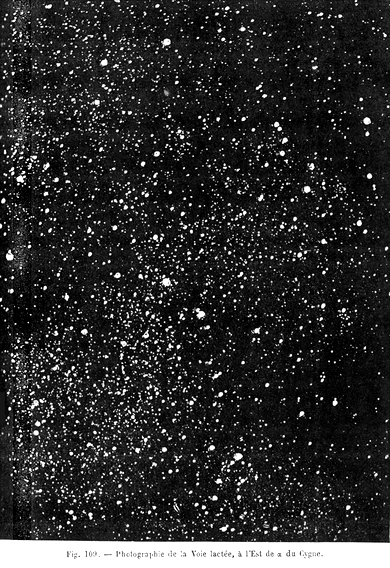 Si nous examinons une autre photographie (fig. 109), par exemple, celle d'une région de la voie lactée, à l'est de l'étoile α du Cygne, nous remarquerons surtout les grandes différences de tons, indiquant une distribution systématique de la poussière lumineuse.