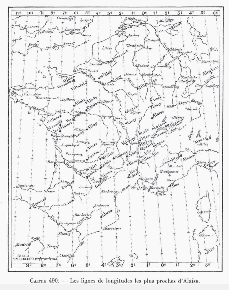 Au tour, maintenant, des longitudes. Elles sont jalonnées par 49 « Alésias », 6 Calais, 3 Versailles.